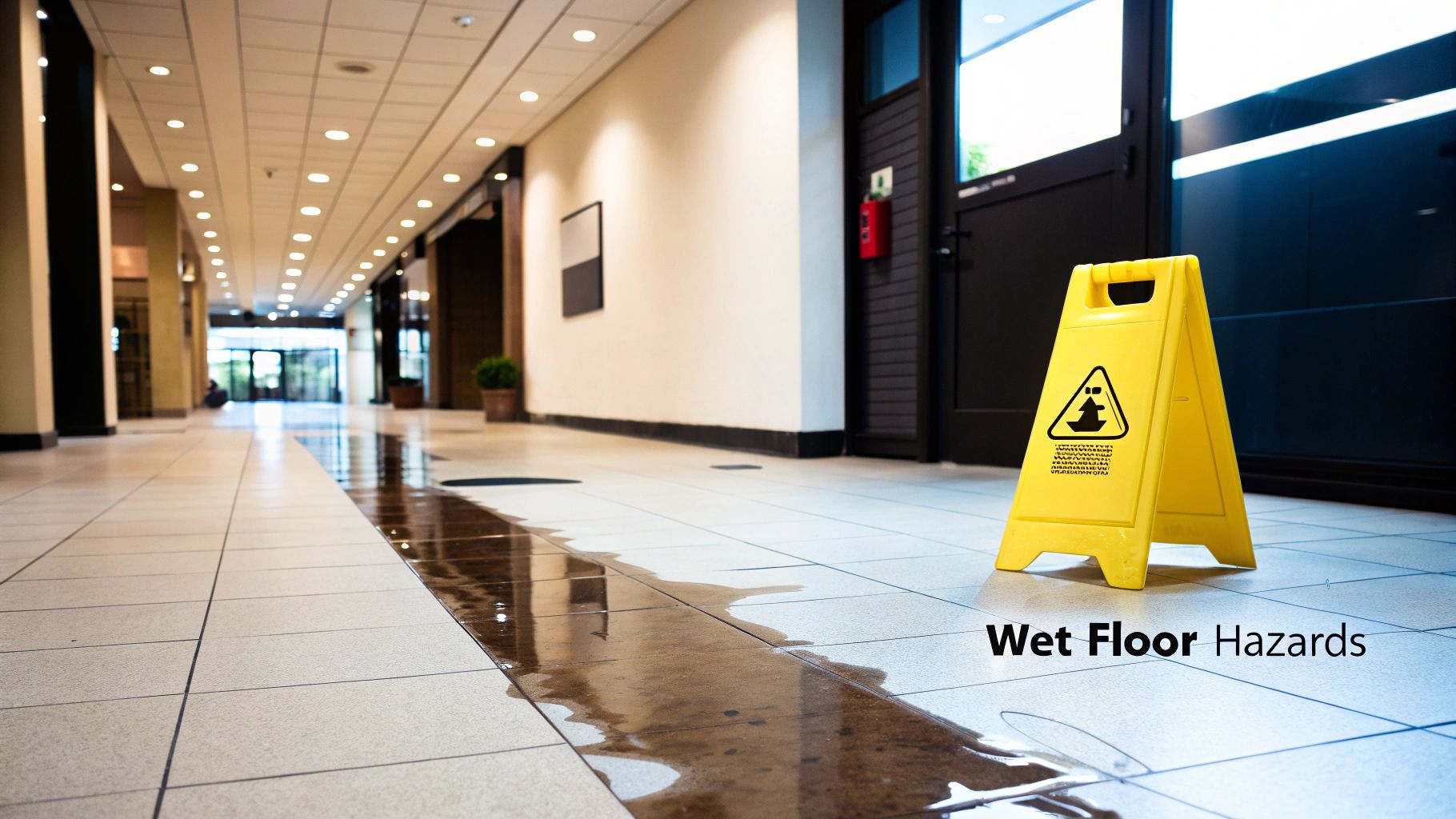 - Wet or Slippery Floors: Unmarked spills, freshly mopped areas without "wet floor" signs, or water tracked in from outside.